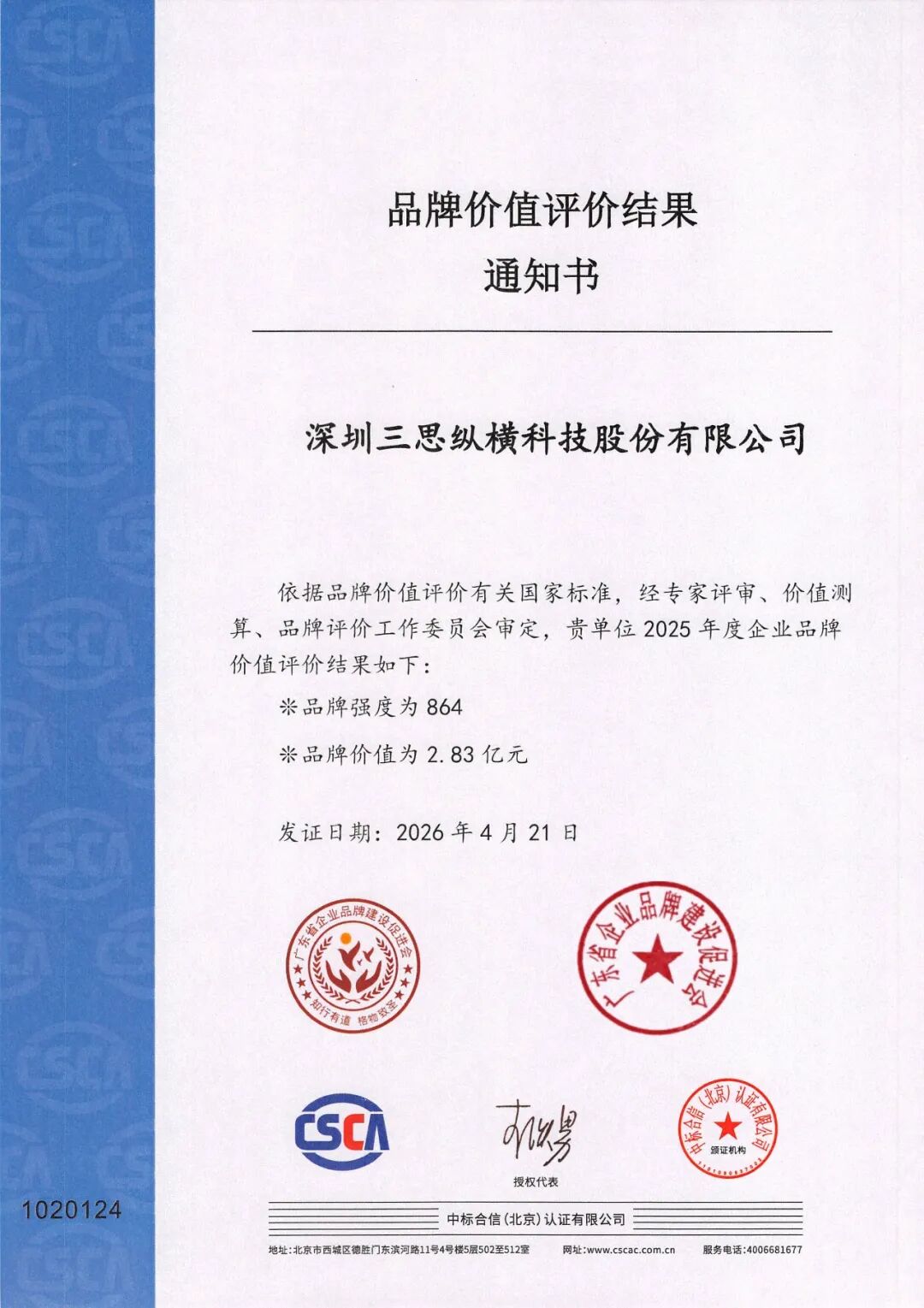 三思纵横多年来,始终坚持研发创新引领,年均研发投入占营收比8%以上。始终坚持品牌发展之路,对品牌建设作出系统规划并一以贯之。三思纵横多年来积极参加国际、国家、行业等标准制修订,累计已参加30多项标准制修订。如今,三思纵横已成长为国家级专精特新“小巨人”企业、“广东省材料与结构力学测试技术工程技术研究中心”、 “广东知名品牌”企业,入选“品牌强国-国货之光首批计划”。公司产品不仅在国内市场领先,更成功出口至欧美、东南亚等地,实现了从“中国制造”到“中国创造”的跨越,印证了中国品牌在高端市场有了与国际品牌同台竞技的实力。在此次峰会上,三思纵横顺利通过“广东知名品牌”复审,三思纵横品牌获评价值2.83亿元。